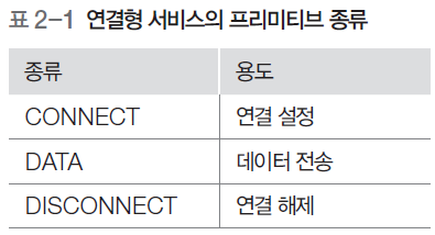 - 연결형 서비스 : 데이터 전송 전에 미리 연결을 설정하여 전송하는 방식