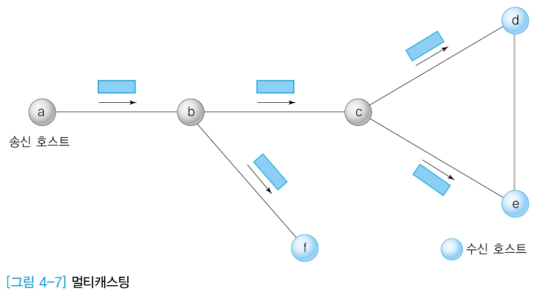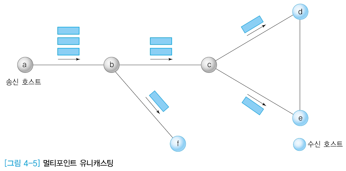 - 호스트 a가 호스트 d, e, f에게 데이터를 전송하려면 3번의 송신 절차가 필요