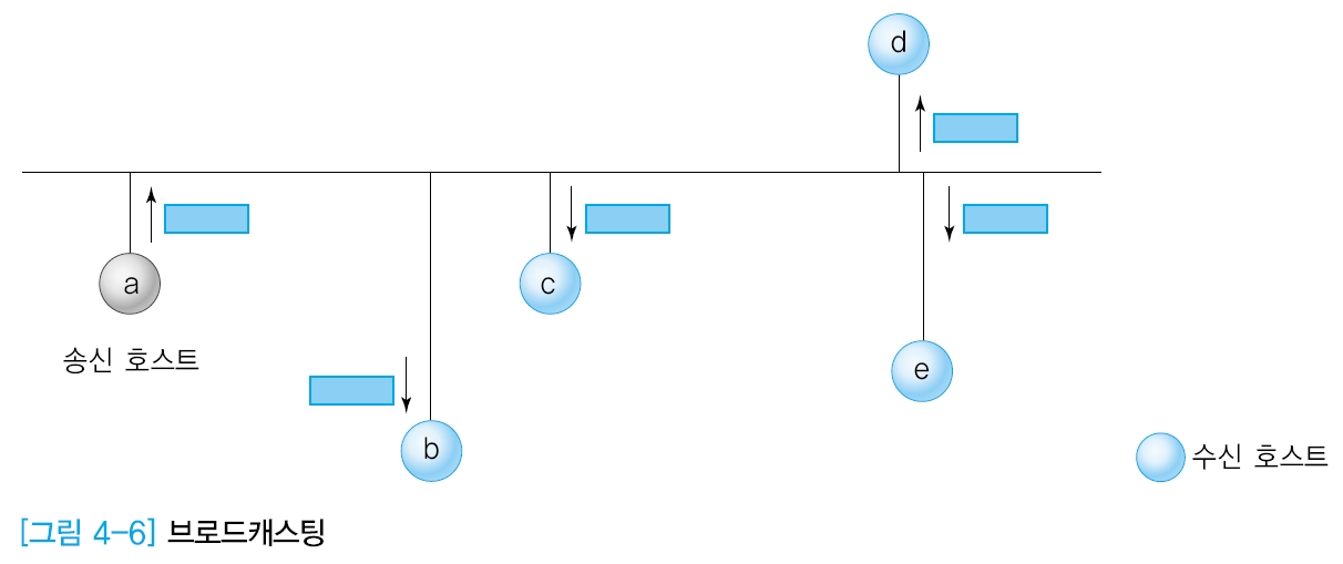 - 송신 호스트가 한번의 전송으로 네트워크의 모든 수신 호스트에 데이터를 전송 (1:all)