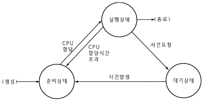 - 대기(waiting) : 요청된 사건(ex: 입출력 사건) 발생이 처리되기를 기다리고 있는 상태