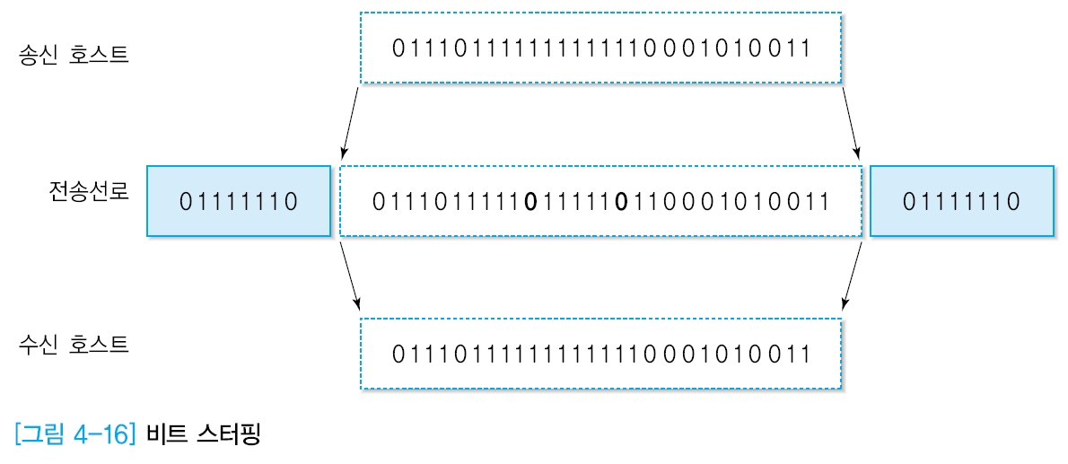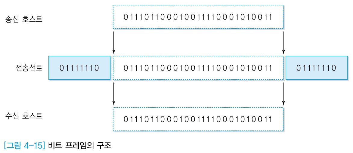 - 프레임의 시작과 끝을 구분하기 위하여 플래그 (01111110) 사용
