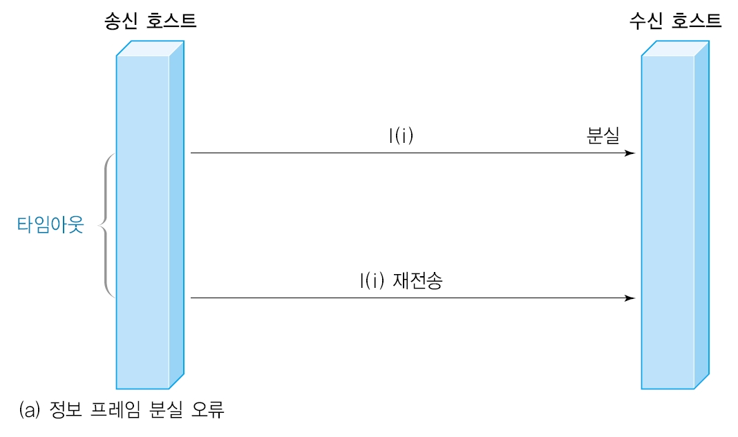 - 정보 프레임 분실: 송신 호스트의 타임아웃 기능으로 오류 복구