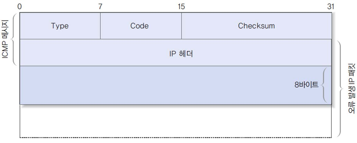 - ICMP 메시지 내용: 오류 메시지 전송시 오류의 원인 패킷 정보를 전송 (오류 보고 메세지)