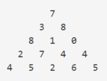 맨 위층 7부터 시작해서 아래에 있는 수 중 하나를 선택하여 아래층으로 내려올 때, 이제까지 선택된 수의 합이 최대가 되는 경로를 구하는 프로그램을 작성하라. 아래층에 있는 수는 현재 층에서 선택된 수의 대각선 왼쪽 또는 대각선 오른쪽에 있는 것 중에서만 선택할 수 있다.