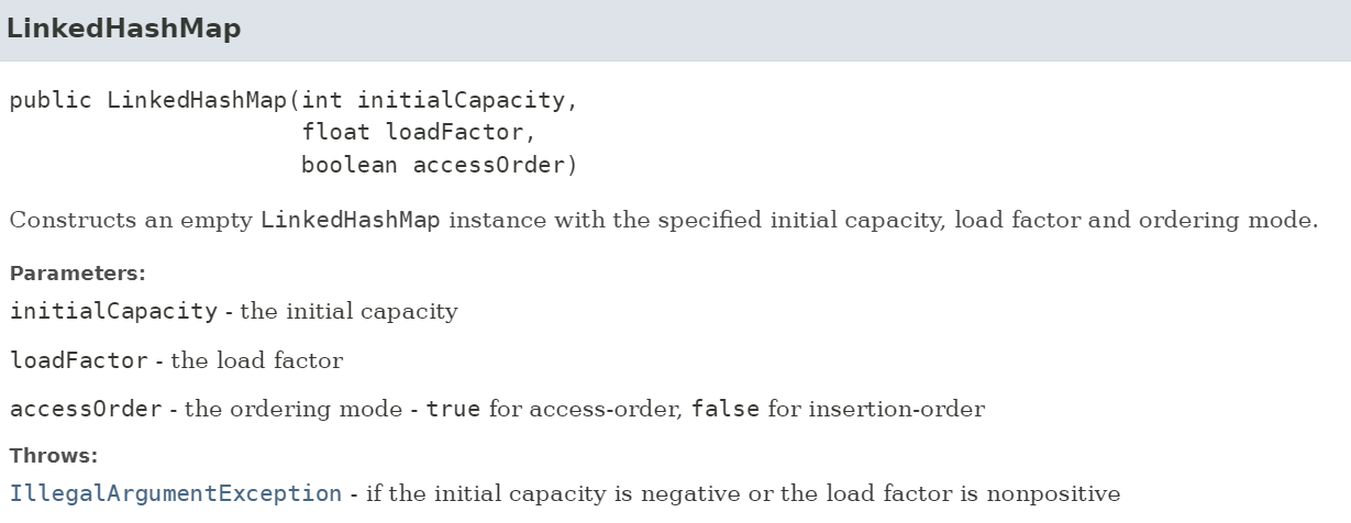 먼저 LinkedHashMap을 생성해주는데, 생성시 매개변수 3개를 넣어준다.
