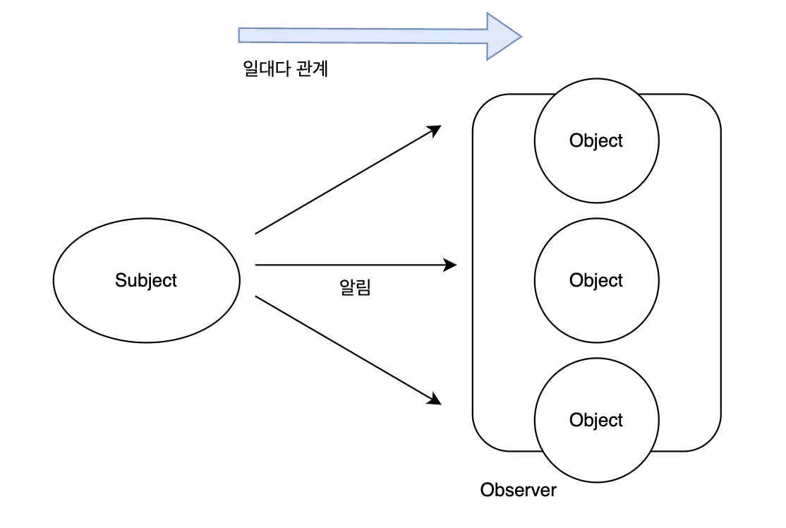- 어떤 객체의 상태가 바뀌면 그 객체를 구독하는 다른 객체(옵저버)에게 알림을 보내는 패턴