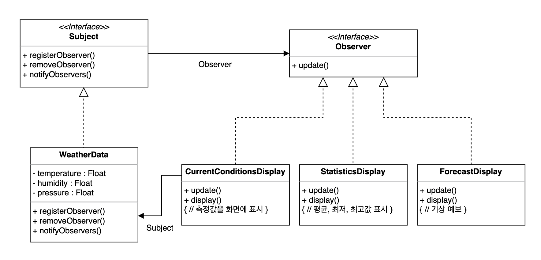 - Subject는 온도, 습도, 기압 데이터가 변경될 때마다 Observer에게 알림을 보낸다.