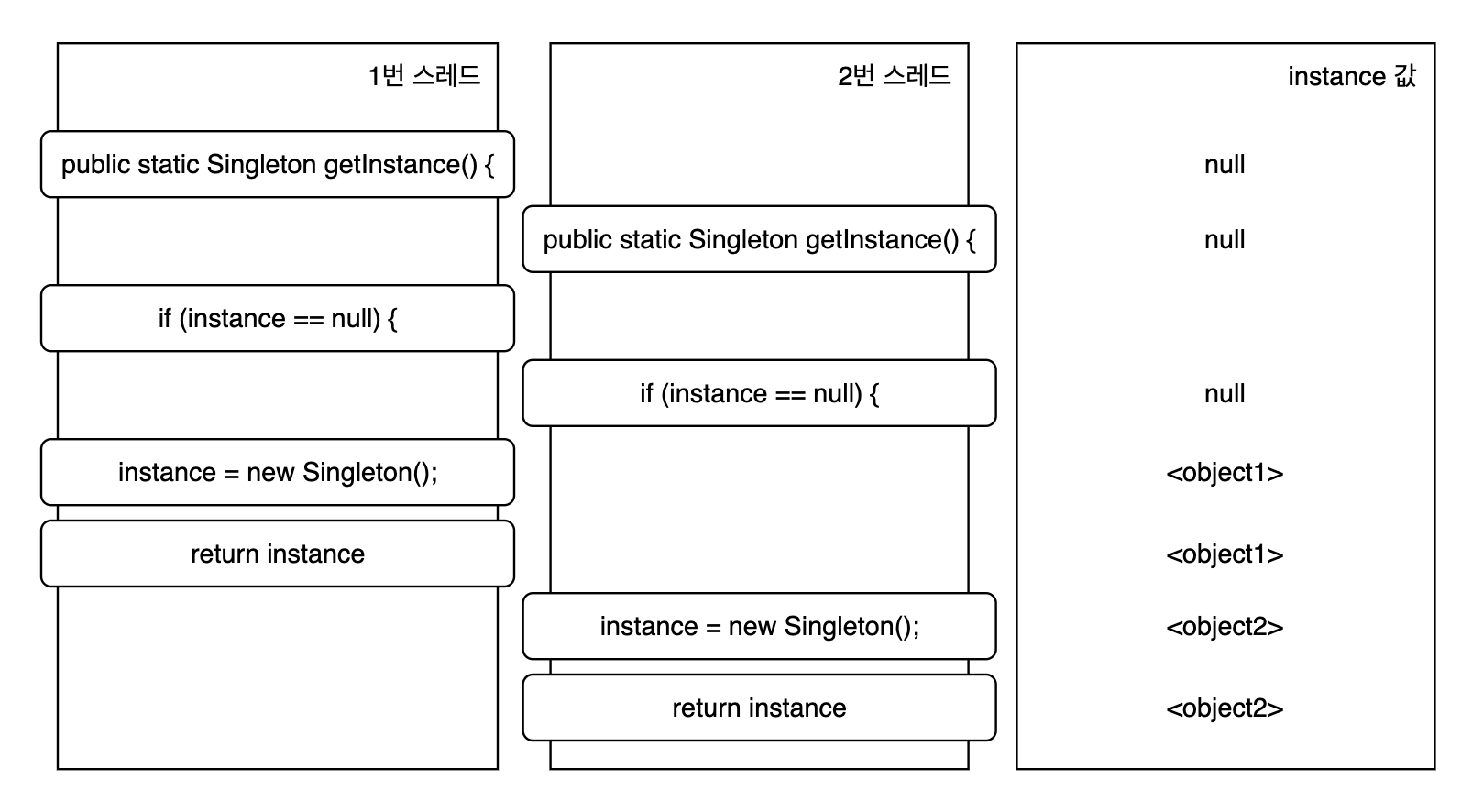 - 두개의 스레드가 동시에 접근할 경우, 둘다 null인 if문을 만족시키고 서로 다른 인스턴스가 두개 생성될 수 있다.