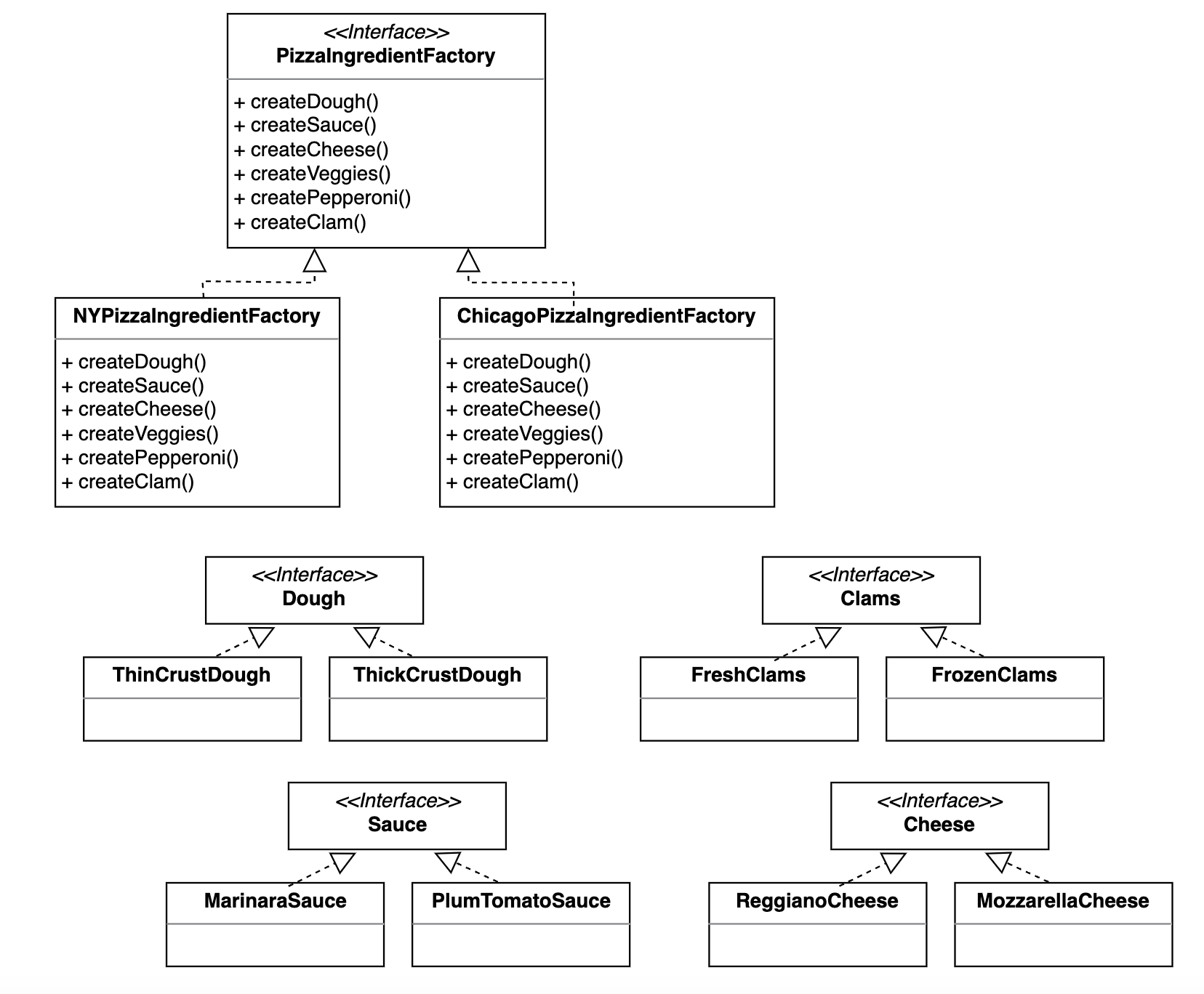 - 하나의 피자 클래스(CheesePizza)에서 IngredientFactory가 어떤 서브 클래스인지 따라 피자의 재료를 선택한다.