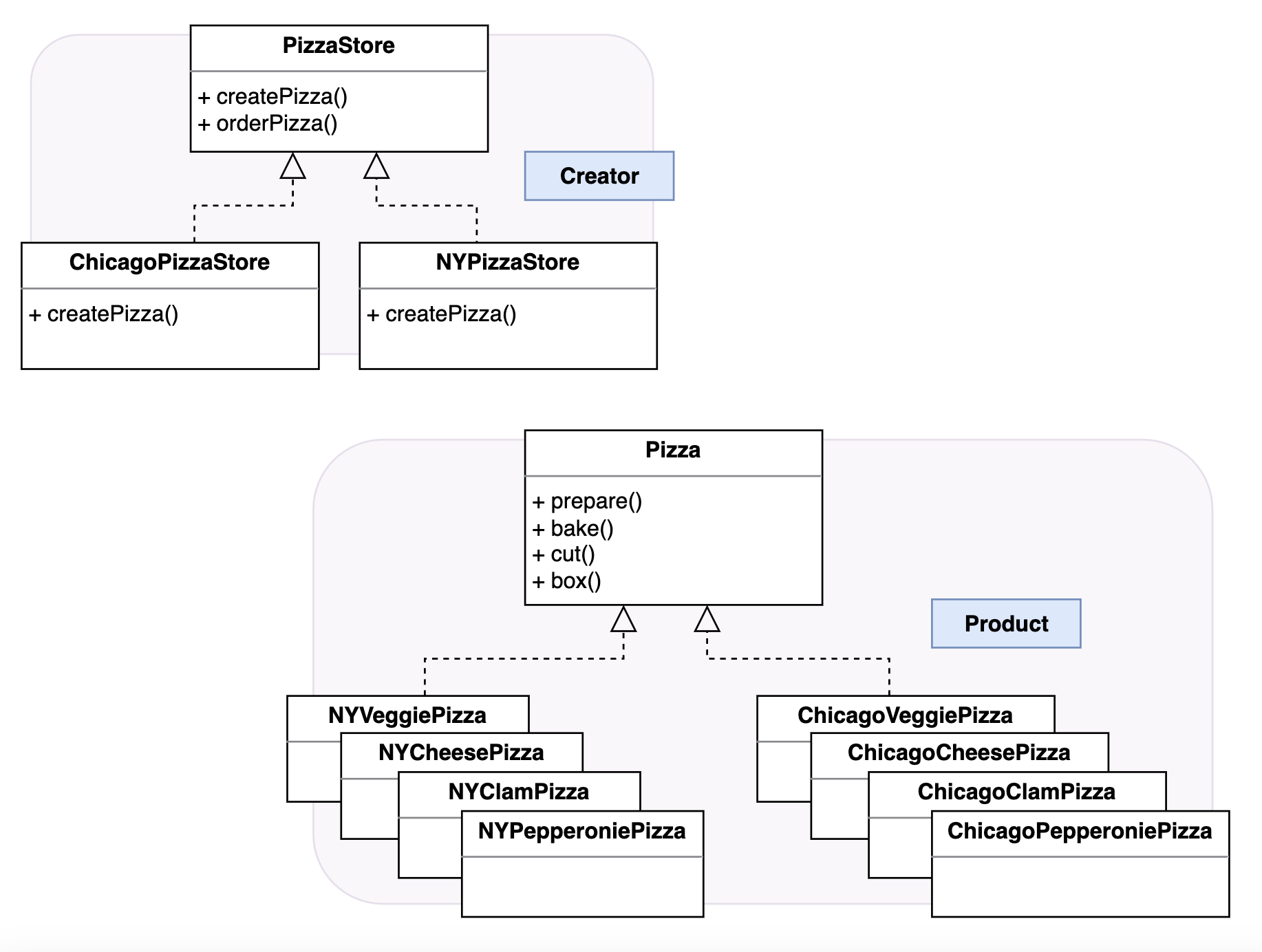 - orderPizza()는 상위 클래스인 PizzaStore의 메소드이며, orderPizza() 안의 createPizza()는 세부적인 PizzaStore에서 구현한 메소드다.