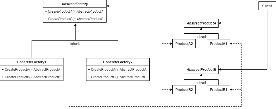 - 제품군을 생성하기 위한 인터페이스를 제공한다. 실제 제품을 생성하는 클래스는 인터페이스를 구현하여 사용한다.