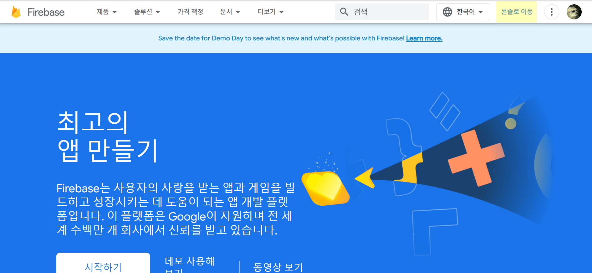 1) https://firebase.google.com/?hl=ko 링크에 접속하여 오른쪽 상단 "콘솔로 이동" 버튼을 클릭한다.