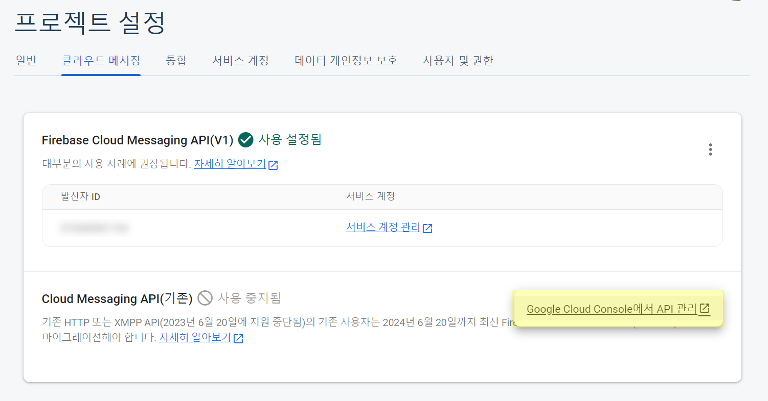 2. 프로젝트 설정-클라우드 메시징-Cloud Messaging API-서버 키