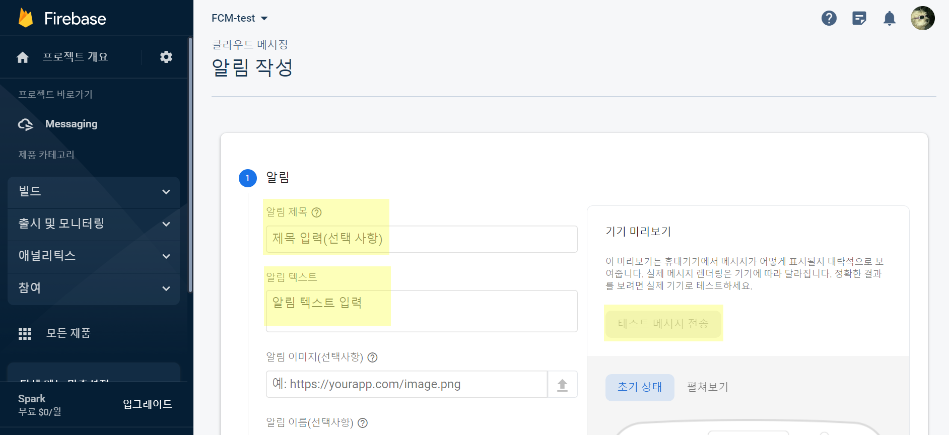 여기서 Notification을 보낼 제목과 텍스트를 입력하고 "테스트 메시지 전송" 버튼을 누른다.