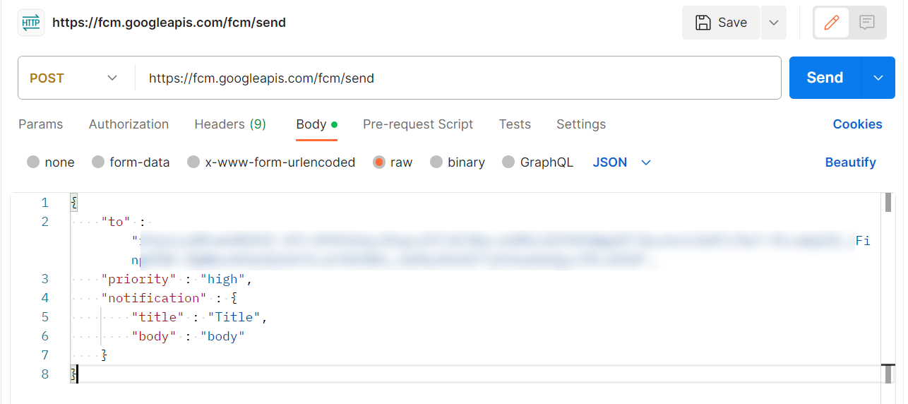 Body는 위와 같이 입력한다. "to"의 value는 디바이스의 토큰을 입력한다. (priority 생략 가능)