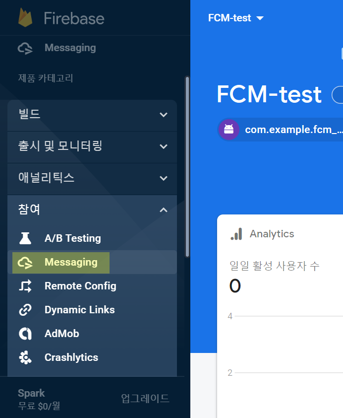 만들어둔 Firebase project로 이동한 후, 왼쪽 메뉴의 참여 - Messaging을 클릭한다.