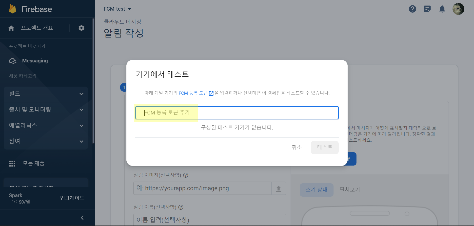 버튼을 누르면 뜨는 창에 메시지를 보내려는 디바이스의 FCM 토큰을 입력한다.