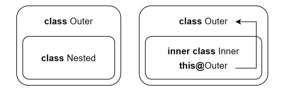 - nested class는 단순히 외부 클래스의 공간 안에 정의된 클래스일 뿐이다. 외부 클래스와 어떤 것도 공유하지 않는다.