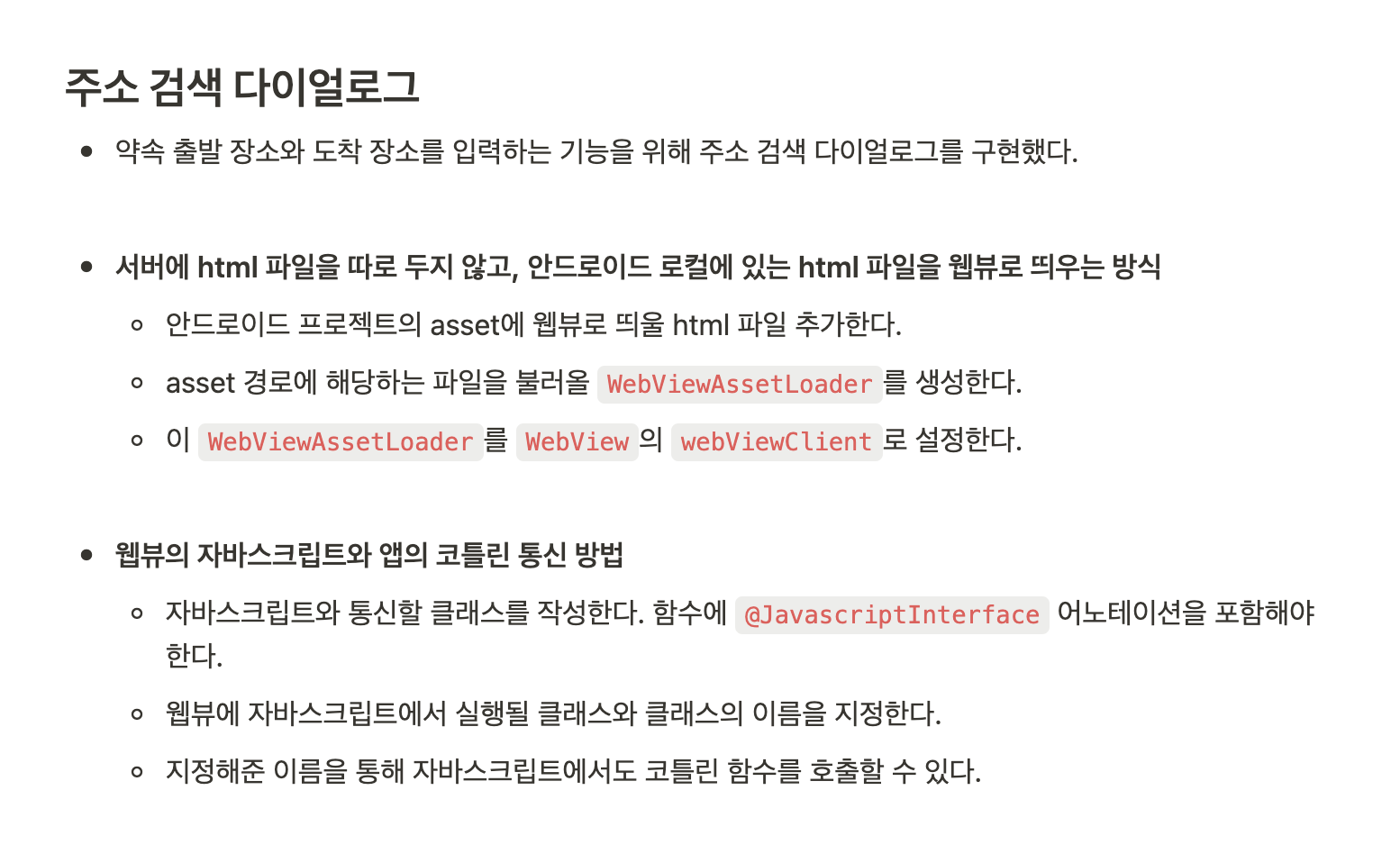 주소 검색 쪽이 조금 어려웠다. 주소 검색 API가 따로 API 키를 발급해서 호출하는 방식이 아니라 정형화된 HTML 문서가 있었다. 이 HTML을 WebView로 띄워야 하는 상황이었다. WebView를 사용하는 것이 처음이었고, 그 HTML을 서버에 배포를 할지 아니면 로컬에서 띄울지를 고민하는 과정이 어려웠다.