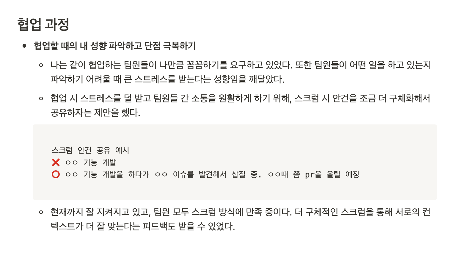 먼저 우리팀은 매일 아침 스크럼을 진행한다. 스크럼 때 자신의 진행 상황을 최대한 구체적으로 공유하자라는 제안을 했다. 예를 들어서 어떤 기능 개발을 할 예정이다라고 하기보다는 어떤 기능을 개발하고 있는데 어떤 버그가 발생을 해서 PR은 언제까지 올릴 것 같다라고 구체적으로 말하는 방식이었다. 현재까지 잘 지켜지고 있고, 이를 통해서 제 통제적인 성향도 스트레스를 덜 받게 되었고 협업의 효율성도 증가하게 되었다.