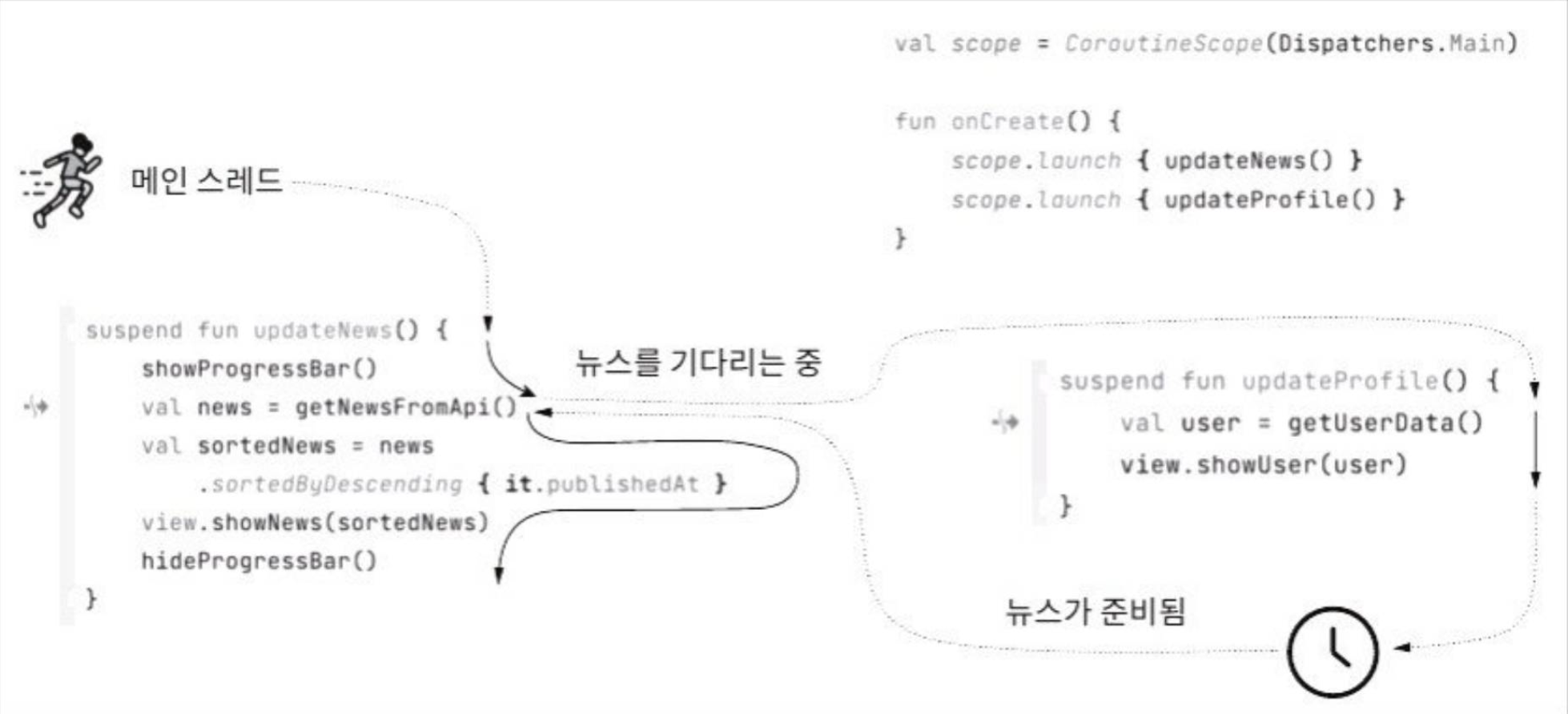 - 데이터가 준비되면 코루틴은 메인 스레드에서 대기하고 있다가 메인 스레드가 준비되면 멈춘 지점에서 다시 작업을 수행한다.