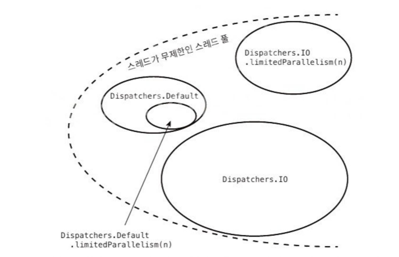 - 스레드 수를 제한한 Dispatchers.IO와 특정 스레드 풀을 사용하는 커스텀 디스패처는 블로킹하는 함수를 많이 호출할 때 사용한다.
