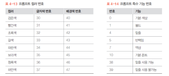 이 때 x, y에는 각각 글자색 번호와 배경색 번호가 들어감. n은 특수 기능 번호.