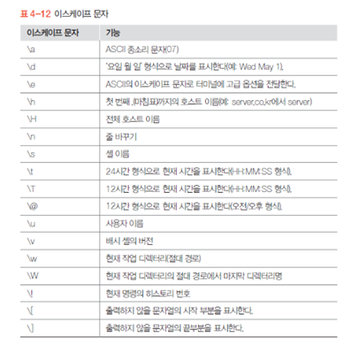 echo $PS1을 통해 내용을 확인하면, \e, \u, \h, \w 등 \로 시작하는 문자로 구성. 이 \로 시장하는 특별한 문자를 이스케이프 문자라고 함. 셸이 이스케이프 문자의 의미를 해석하여 실행. 즉, 프롬프트를 바꾸기 위해서는 환경 변수 PS1의 값을 변경하면 됨.