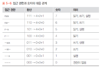 각 권한이 있고 없고를 0과 1(000~111)로 표기하고 이를 다시 10진수의 숫자로 환산(0~7)하여 표현함.