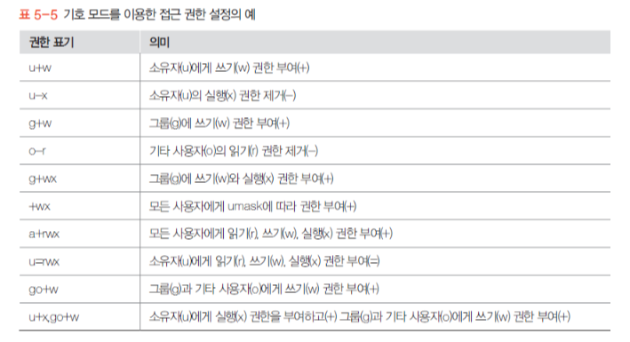 ex) test.txt 파일의 소유자의 쓰기 권한을 제거하는 명령 -> chmod u-w test.txt