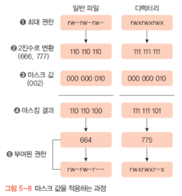 * 마스크 값: 파일이나 디렉터리 생성 시 부여하지 않을 권한을 지정해놓는 것. ex) 마스크 값이 002 일 때 기호 모드로는 -------w-. 이를 뒤집으면 rwxrwxr-x 이 됨. 즉, 775의 접근 권한을 부여하겠다는 뜻