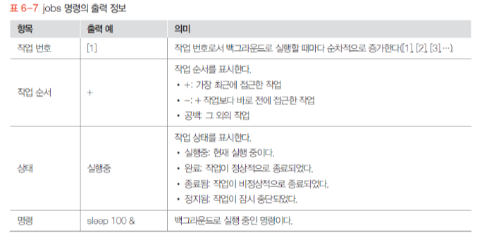 백그라운드 작업 : 명령을 실행하면 명령의 처리가 끝나는 것과 관계없이 곧바로 프롬프트가 출력되어 사용자가 다른 작업을 계속할 수 있는 프로세스를 백그라운드 프로세스라고 하며, 작업 제어에서는 이를 백그라운드 작업이라고 함. 명령의 마지막에 & 기호를 추가하면 백그라운드로 실행이 가능.