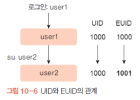 - su 명령을 사용하여 다른 계정으로 전환한 경우 : EUID가 다른 계정의 UID로 바뀐다.